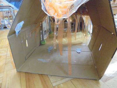 1階の学習室に、2年生たちが作った大きな作品がありました。ダンボールで一つのトンネルができています。ただのトンネルではなく、顔を出す窓やかざり付けなど、いろいろな工夫がされています。