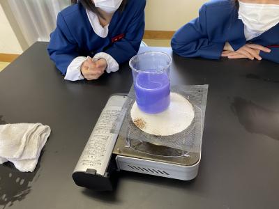 実験でサーモインクを入れたビーカーの水を端の方から温めました。青色だった水がどんどんピンクに変わっていきます。熱せられているところからピンクに変わり,上に上がっていく様子がよくわかります。初めに上の方がピンクになり,やがて動きながら全体がピンクになります。