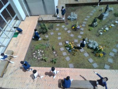 休み時間中の中庭では、多くの子が、日向ぼっこをしたり石畳の上やウッドデッキの周りで遊んだりしている姿が見られました。