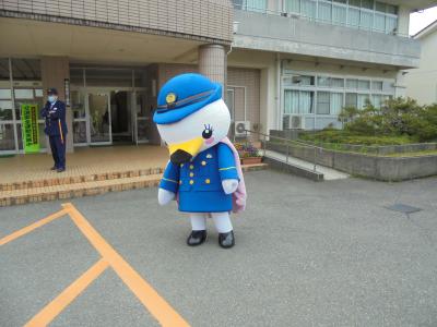 今朝、津幡警察署のキャラクター「白鳥(しらとり)係長」が、子どもたちの登校の様子を見守りに来ました。津幡警察署や駐在さん、見守り隊の方々も一緒に見守ってくださいました。