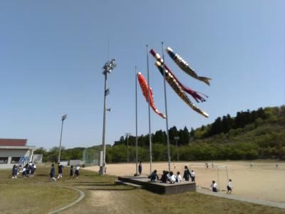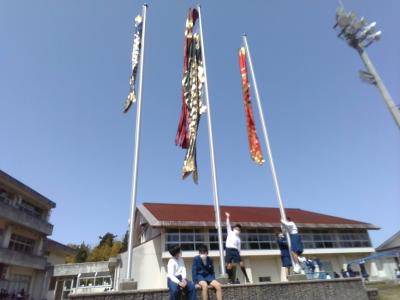 今日は晴天に恵まれ、春の陽気に包まれた中、公民館からお借りした鯉のぼりを子どもたちにあげてもらいました。
