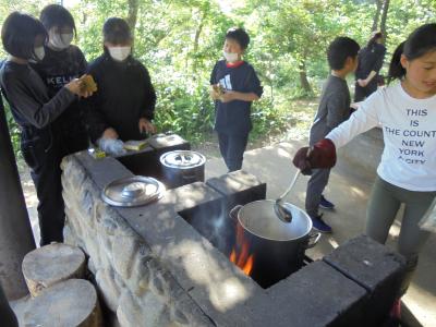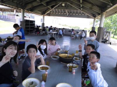 午後からは野外炊飯で,カレーを作りました。火おこしや野菜などの調理にみんなで取り組みました。どの班のカレーも上手にできていました。