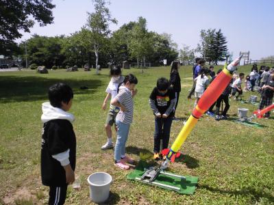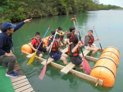 午前中はいかだ体験でした。自分たちでいかだを組み立て池に浮かべ,みんなで漕ぎました。なかなか思った通りに進まず,苦戦していたようです。