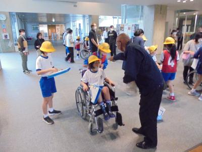 休館日の町文化会館シグナスの館内をお借りし、車イスを使い、実際の体験活動を通しながらバリアフリーについて調べました。
