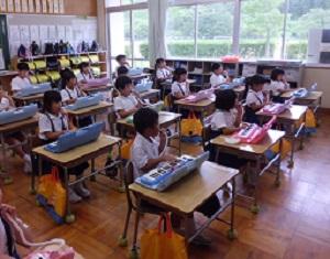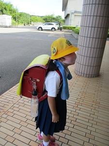 そんな中、一生懸命登校してくる子どもたちです。よく見るとお家の方が、首からかける冷たいタオルを準備してくださっていました。ランドセルの横には、濡れたタオルを入れるボトルも付けてくださっています。それ以外にも、日傘をさしてきているお子さんもいらっしゃいます。子どもたちの安全・安心のために色々と工夫していただきありがとうございます。学校としても、日傘や首に巻く冷たいタオルは、決して禁止はしておりません。