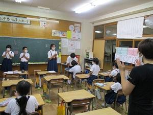 今日もとても蒸し暑い朝でした。グッドマナーキャンペーンの幟が立つ玄関では、あがたっ子の元気な挨拶の声が響いています。