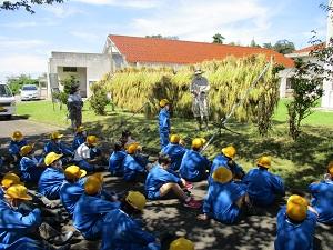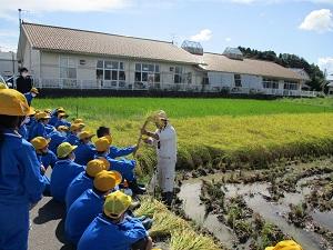 いつもご指導いただいている大浦さんご夫妻に、一粒がこんなに実ることの不思議さや稲を刈る時の注意をしていただきました。