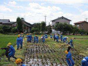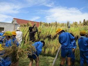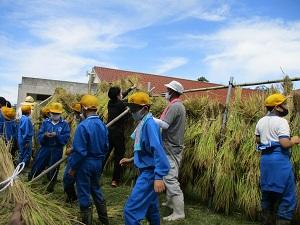 足元を取られながら、時には尻もちをついて泥だらけになりながら、やっと刈り取った稲の束。今度は8株ほどまとめて縛りますが、力を入れて縛らないとゆるくて、やり直しになってしまいます。簡単だと思っていたみんなも、こんなに大変なのかと思いながら、それでも終わるまでは帰れないと分かっているので必死で頑張りました。
