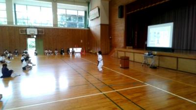 夏休み中や9月に頑張った児童の表彰や校長先生の話,3年生による暗唱や空手の型の部で全国優勝した中川さんの演技もありました。