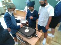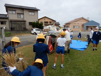 先月学校田で稲刈りをし、敷地内に「はさがけ」してあった稲の脱穀を行いました。
