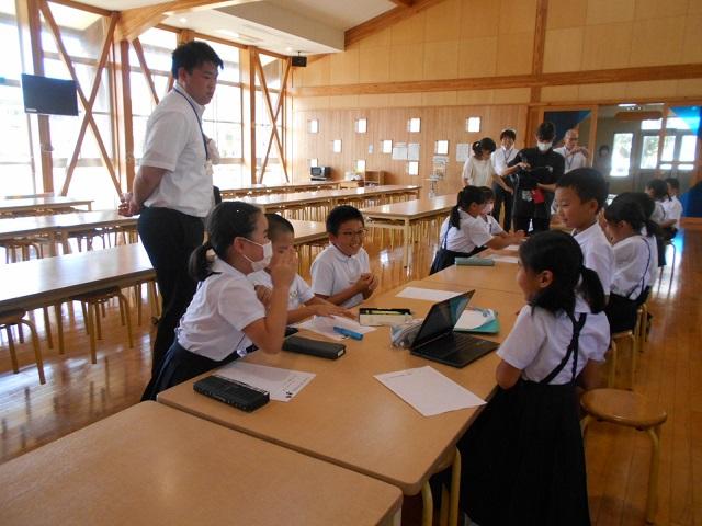 押水地区3校の5・6年生約80人が集まり、国語、算数、社会など、複数の教科の力が試される課題に挑戦しました。ワークショップ形式の課題を通じて、考えを出し合い、学びを深めました。