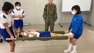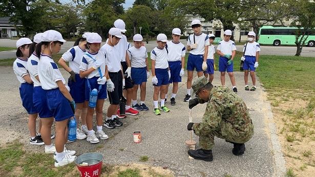 自衛隊金沢駐屯地で、相見小・宝達小・押水第一小の3校で防災体験教室が行われました。午前の活動では、3つのグループに分かれて、土のうやテントを作ったり、火おこしをしたりしました。また、ロープの結び方や担架の作り方を学びました。午後からは、負傷者の運び方を指導してもらったり、自衛隊の大きな車両に乗せてもらったりしました。