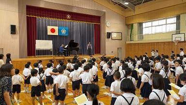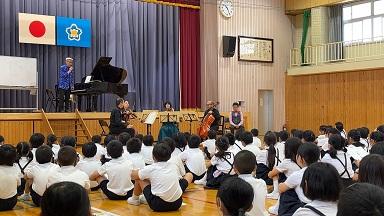 青島 広志 先生とオーケストラ・アンサンブル金沢のメンバーの方が「宝達志水町」に来てくださいました。そして、相見小学校・宝達小学校・押水第一小学校の児童 約220人が本校の体育館に集い、ミニコンサートが行われました。青島 広志 先生のピアノと、ヴァイオリン・ヴィオラ・チェロの本物の楽器の音色、小野 勉さんのテノールの歌声に体育館全体が包まれました。また、青島 先生のユーモアたっぷりのお話を交えた解説から、一つ一つの曲に込められた様々な思い・素晴らしさに新たに気付くことができました。