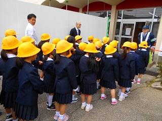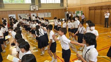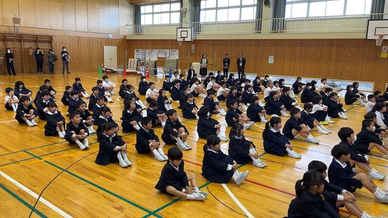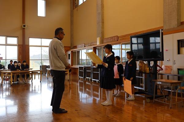 1月28日(火)に、工場関係者をお招きして、校舎完成式を開きました。代表委員会の児童による進行で、児童一人一人の感謝の気持ちが書かれたメッセージカードを工事関係者に手渡しました。令和5年6月から始まった改修工事でしたが、ほぼ工事が完了しました。児童が学校生活を安心・安全に過ごせるように配慮いただきながら工事をしていただきました。工場の代表者からは、「大切に使ってほしい」という思いが伝えられました。