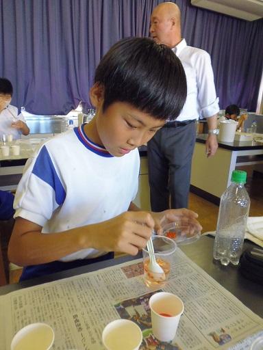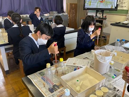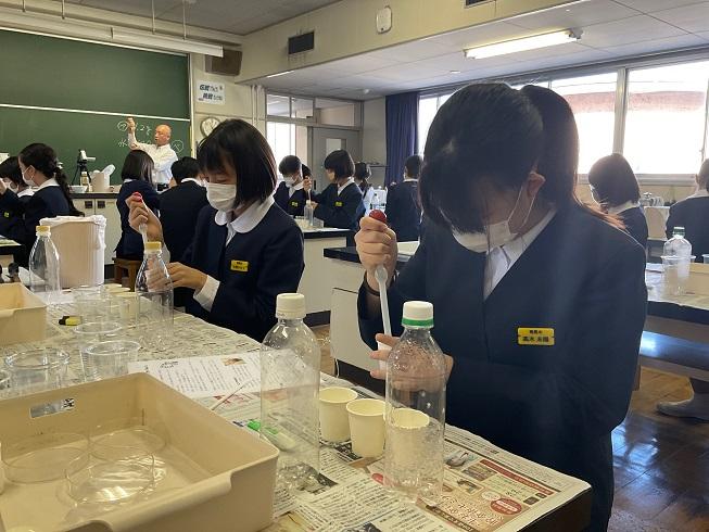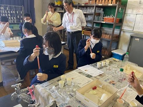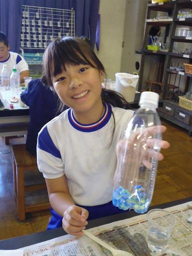 第1回に続き、講師として、木谷先生が来てくださいました。今回は「ゲル化の科学 人口イクラを作ってみよう」という課題で取り組みました。原料はアルギン酸ナトリウム(海藻の成分)や塩化カルシウムです。ペットボトルに入れ、キャップをしめて5分間強く振ることから始まりました。最後には、本物そっくりな「人口イクラ」が出来上がりました。そして、絵の具からお気に入りの3色を選び「色粒人口イクラ」を作りました。ペットボトルに入れると、すてきなインテリアが完成しました。ゲル化の不思議を感じられる体験となりました。