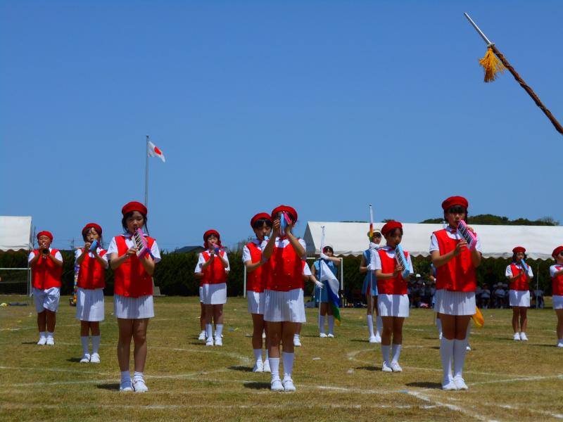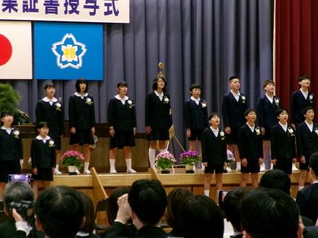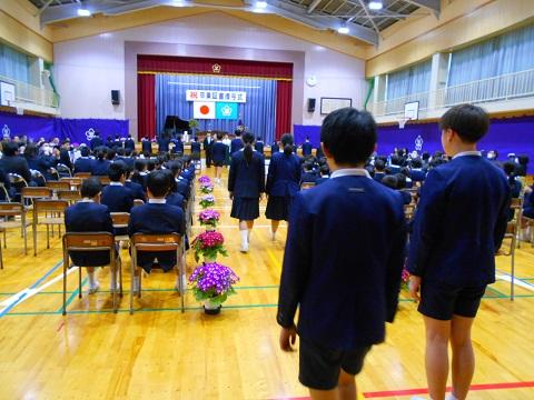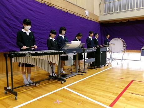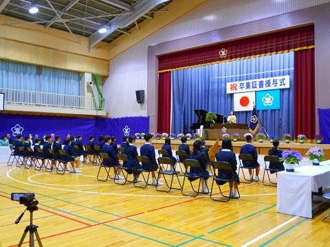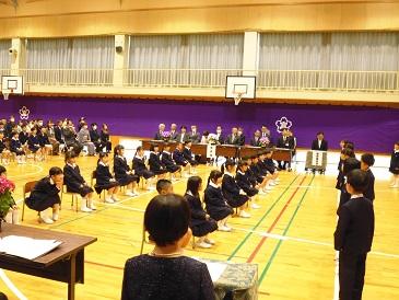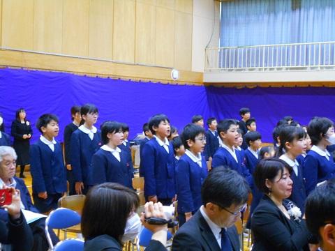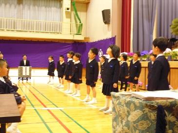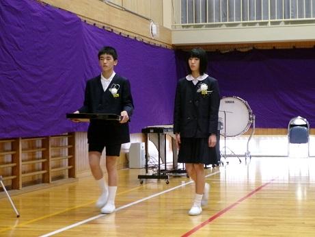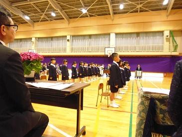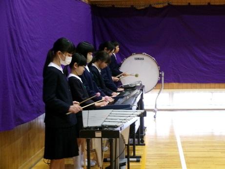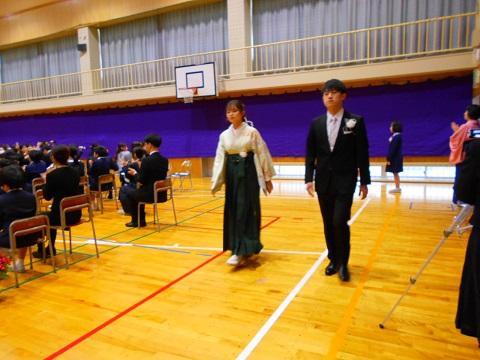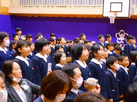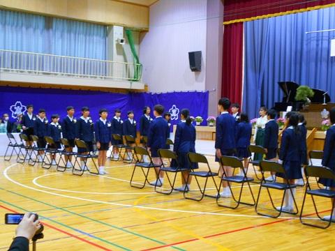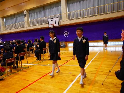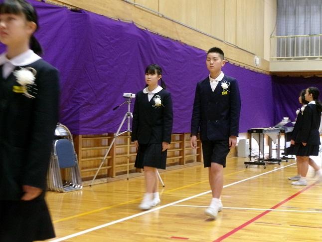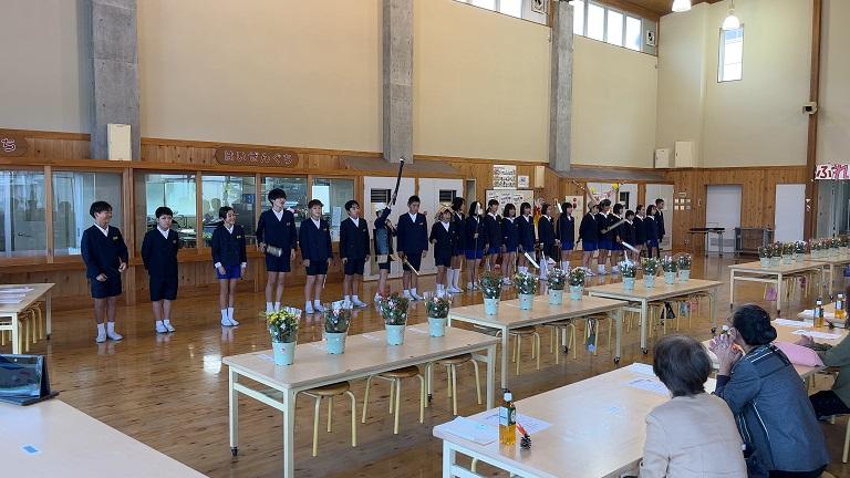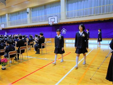 地域の方々のご協力をいただき、在校生と職員が準備した式場へ、卒業生が入場します。入場曲は、5年生と4年生が演奏する「威風堂々」です。