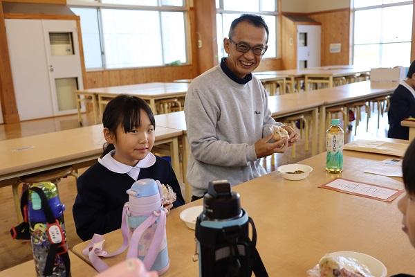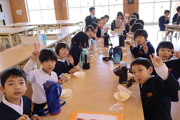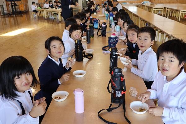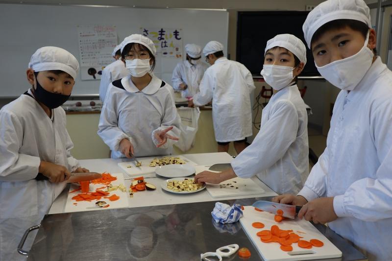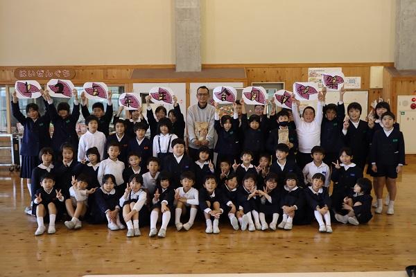 12月4日(水)に、1・2・5年生による合同収穫祭が行いました。さつまいも畑や田んぼお世話をしていただいた地域の先生、田んぼをお貸しいただいた地域の方をご招待し、「農業クイズ」や1・2年生による出し物、5年生による「お米ができるまで」の発表を行いました。そして、みんなで協力して調理した「もともちいももち」「さつまいもご飯」をおいしく食べました。さつまいも畑をお貸しいただいている地域の方へは、収穫したさつまいもを届けました。笑顔いっぱいの楽しい会になりました。