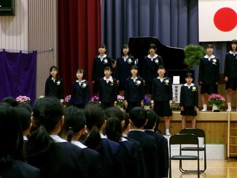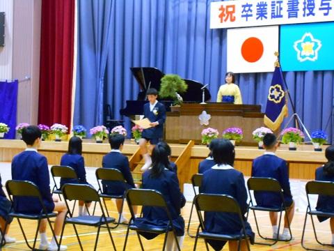 「別れの言葉」在校生が卒業生へ感謝の言葉を、卒業生が今まで育ててくれた周りの方々への感謝や在校生へのエールを送りました。一緒に歌った「大空が迎える朝」が体育館いっぱいに響き渡りました。