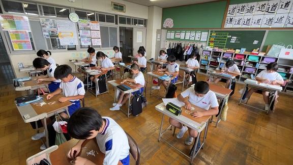 1月8日(水)3学期の始業式のあと、各教室で校内書き初め大会が行われました。1・2年生は硬筆、3~6年は毛筆で書きました。どの子も真剣な表情でお手本を見つめ、集中して作品を書き上げていました。1月8日~10日の16:30~17:30に各教室前廊下に展示していますので、ご覧ください。