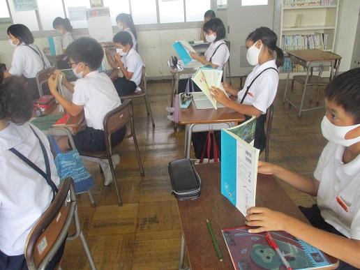 3年生。教室で間隔を空けて、漢字辞典をつかって勉強です。