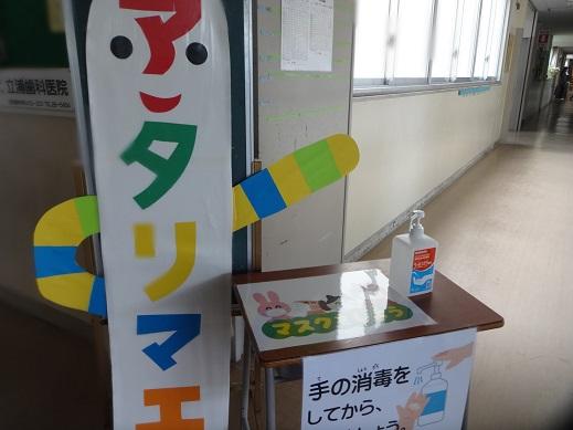 そして、アタリマエぼうやの前で、消毒してから教室へ入りましょう。