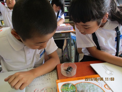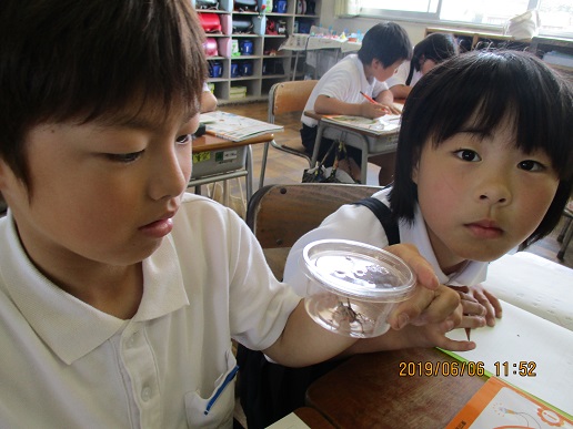 虫の観察をしています。2人ペアで観察中。