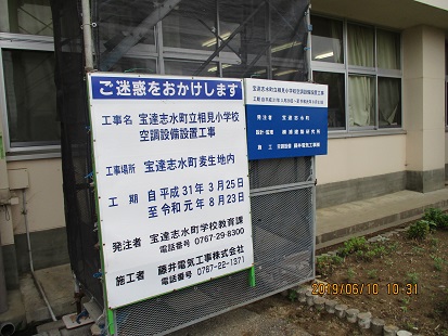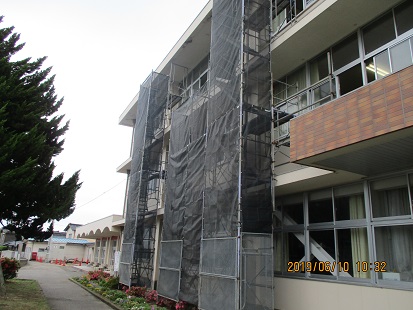 学校の前に、エアコン工事のために足場が設置されました。