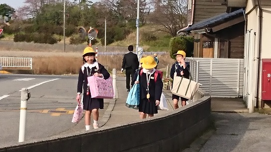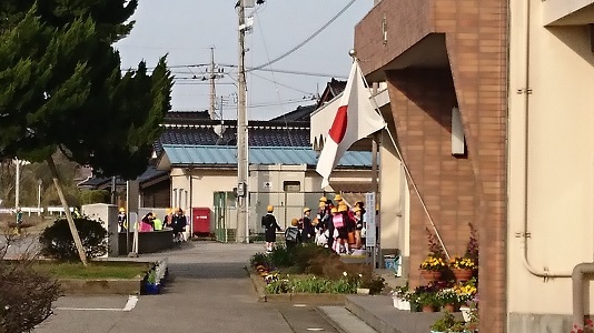 日の丸の向こうに、7:10頃から子ども達が・・・