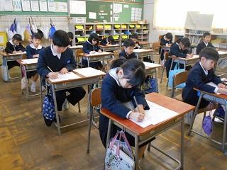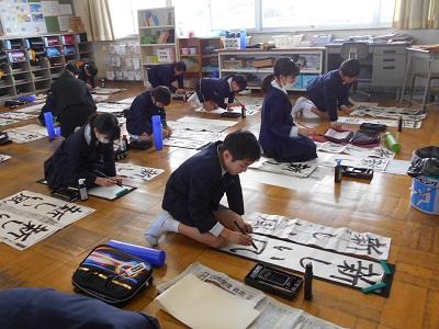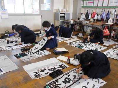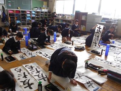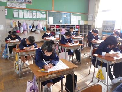 競書会では1・2年生は鉛筆を持って、3~6年生は筆を持って書きました。冬休みの宿題の書き初め練習のがんばりが感じられました。