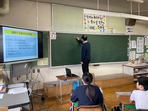5年生のテーマは「数の秘密を見つけ、活用しよう」で、連続する10個の数のきまりについて考えました。「きまりを知り覚えることで終わるのではなく、きまりを使うことを大切に!」とメッセージを頂きました。