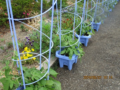と、あいさつ運動の横で、1年生があさがおの水やりです。
