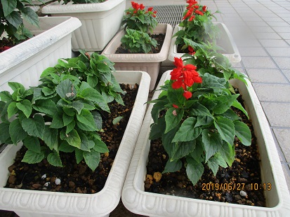 と、その横では、3年生と4年生がサルビアに水やりです。
