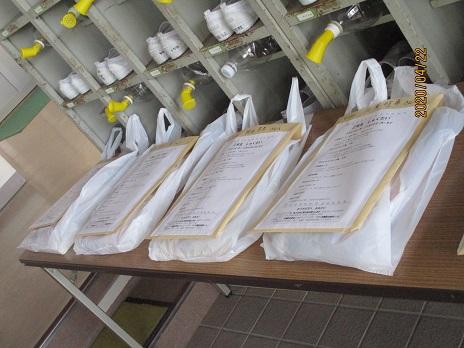 新しい宿題やおたよりが入った袋がこのように並べてあります。