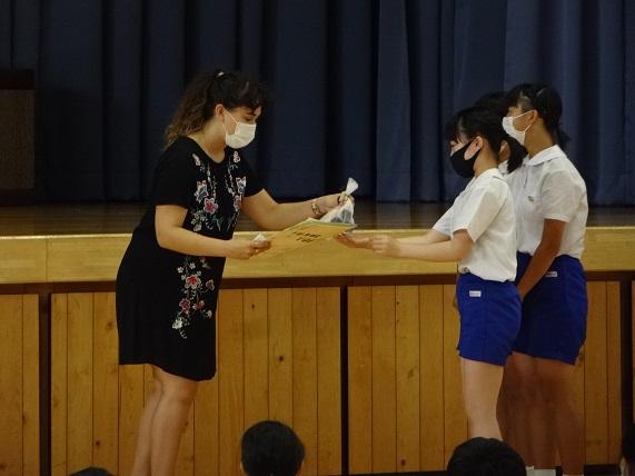 英語でプレゼント渡し。プレゼントは、全校&先生方からのメッセージブックと万華鏡。