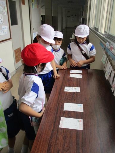 子ども達が、立ち止まっては、ハガキをのぞき込んでいます。