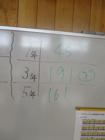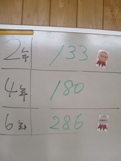 1年生45回、初めてなのによくやった! 3年生191回、汗をかいて練習した甲斐ありブロンズ。5年生161回、悔しいね。練習では、もっと跳べたのに。。。次こそは。。。。