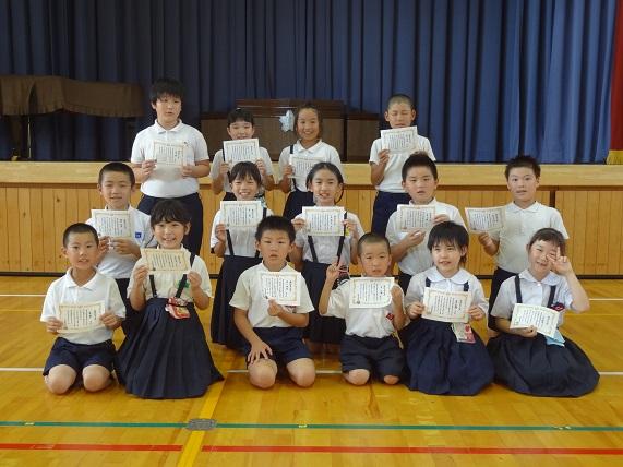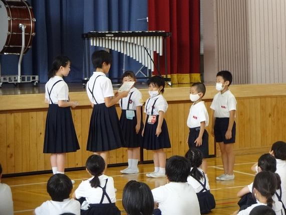 次に、児童会から「あいさつ名人」の表彰がありました。1年生の代表名人4人が賞状を受け取りました。「ありがとうございます。」