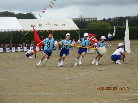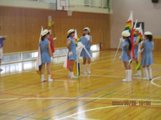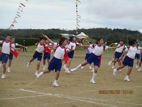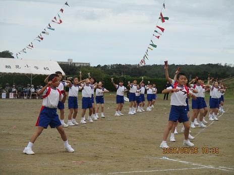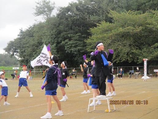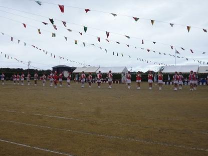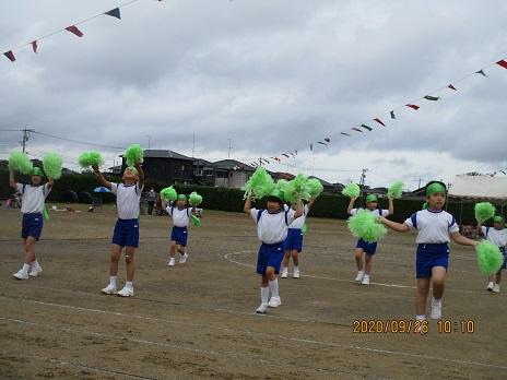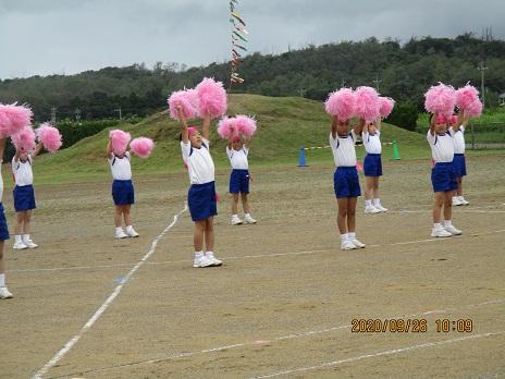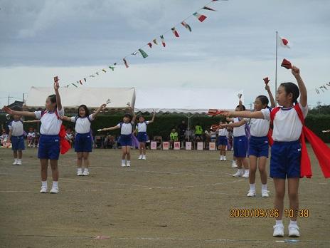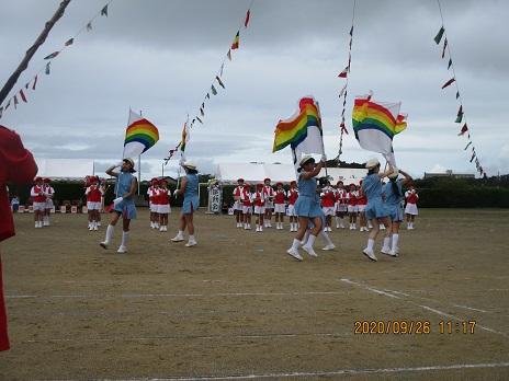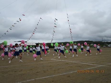 上手に踊れていました☆ 後方で大漁旗2本が、ヒラリヒラリ。5年生の応援です。