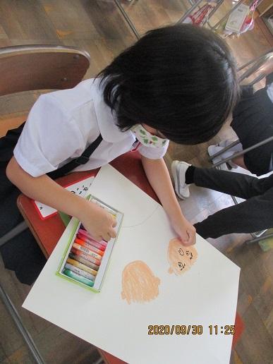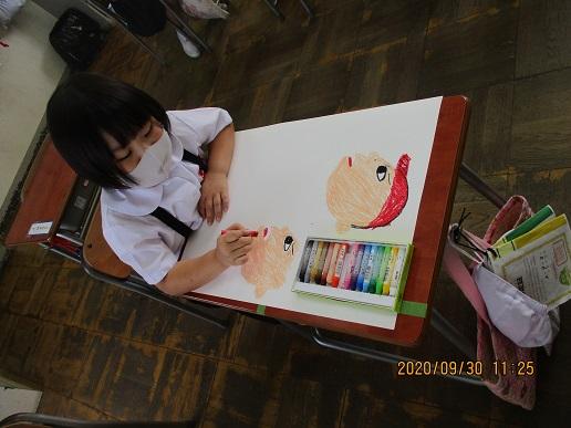 1年生。図工。運動会の絵を描いています。