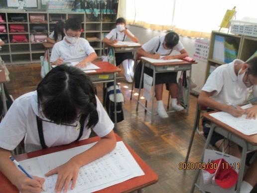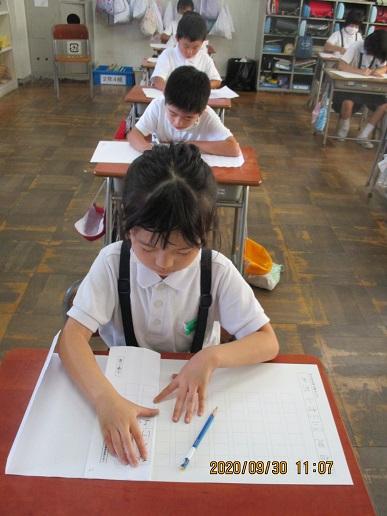 2年生。書写。硬筆コンクールに出すために、手本をよく見て書いています。