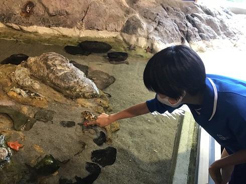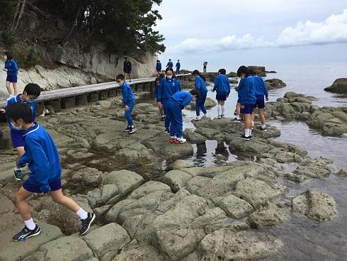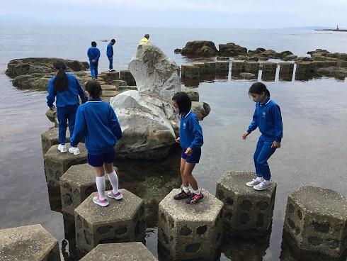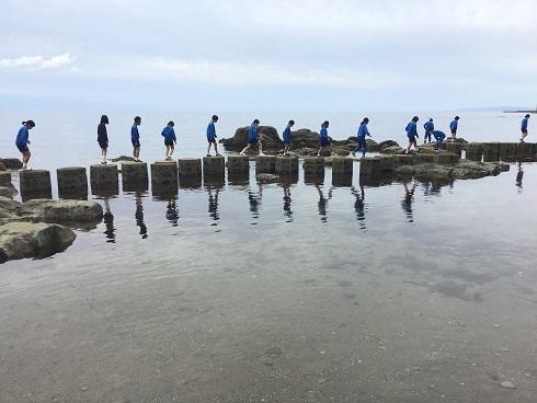 センター周辺の海岸には飛石と床板を組み合わせた自然観察歩道が整備されているので、九十九湾周辺の海岸の生きものを観察しました。
