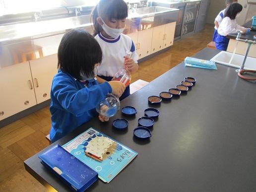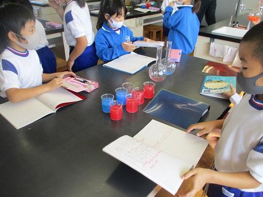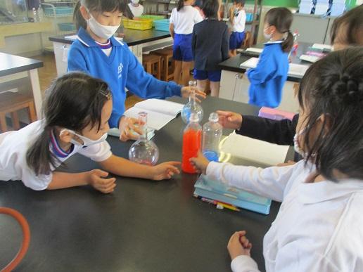 ペットボトルやビーカーを使って、どちらがどれだけ多いかを調べる活動です。