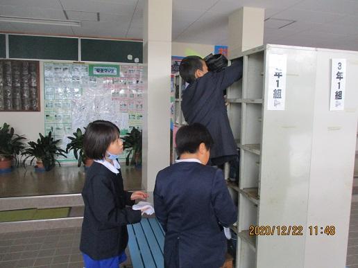 4年生。大掃除中です。下駄箱を拭きます。