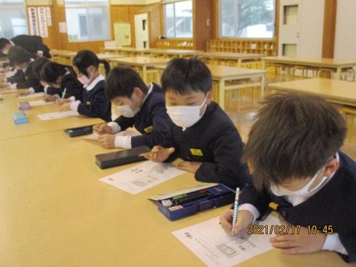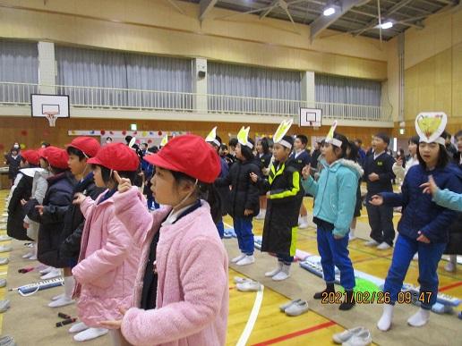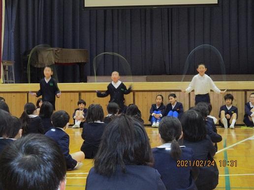 明後日の木曜日には、1,3,5年生が縦割り班で8の字跳びの2回目をします。