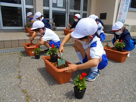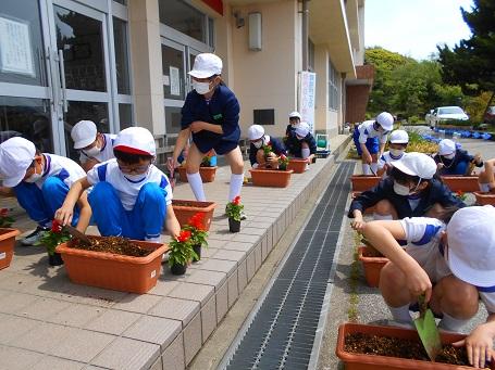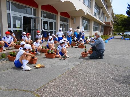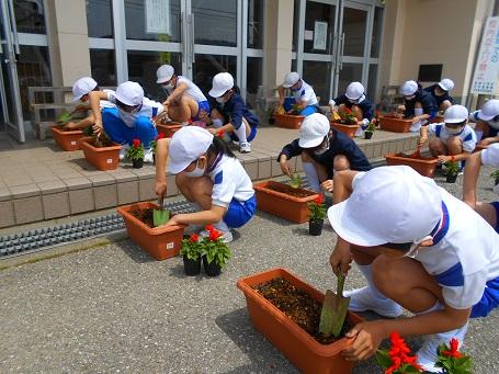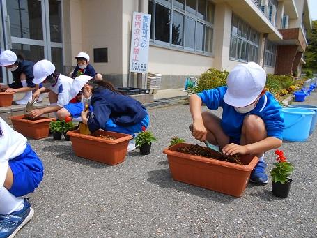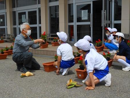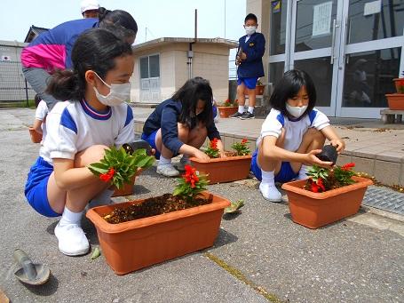 用務員さんに教えてもらいながら、3・4年生がサルビアの苗をプランターに植えました。