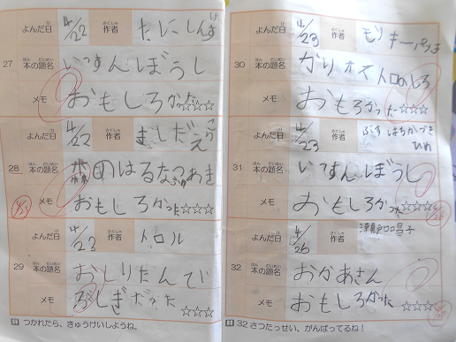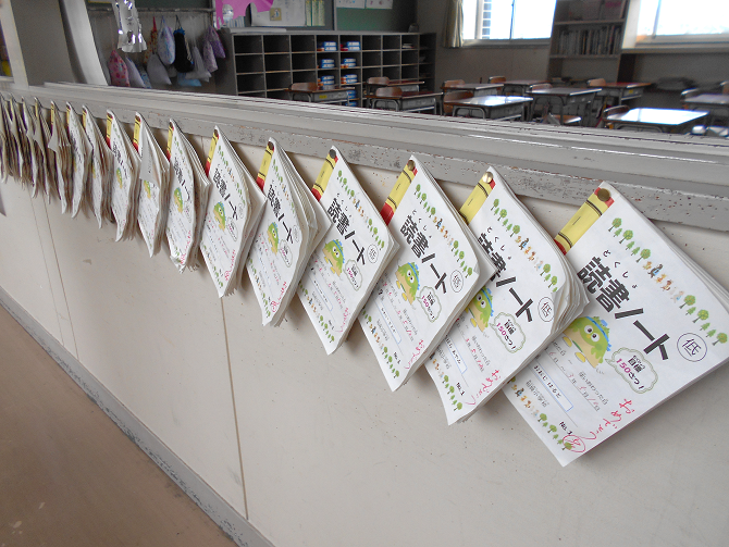 そして,教室へもどってきてから,「読書ノート」に記録します。1冊目は,50冊書くことができます。そのノートが全員おわりました。