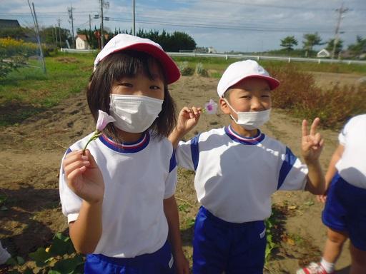 なんと、サツマイモのお花を見つけました。「アサガオと似ているよ!」と。