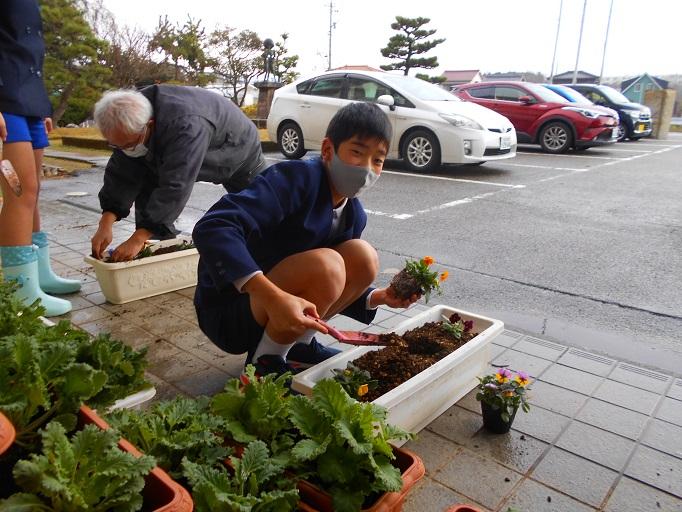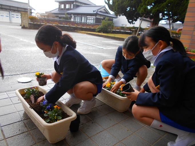 本校の玄関先にはプランターが並び、季節ごとの花々が私たちを迎えてくれます。
