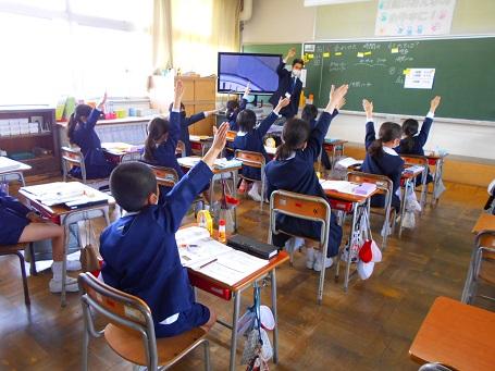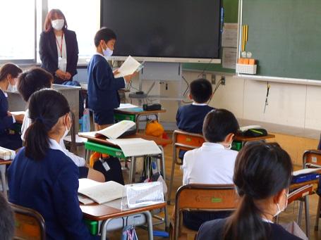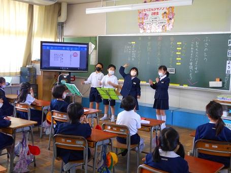 2年国語では、グループに分かれて、様子が伝わるように動作をつけて音読し、その後、音