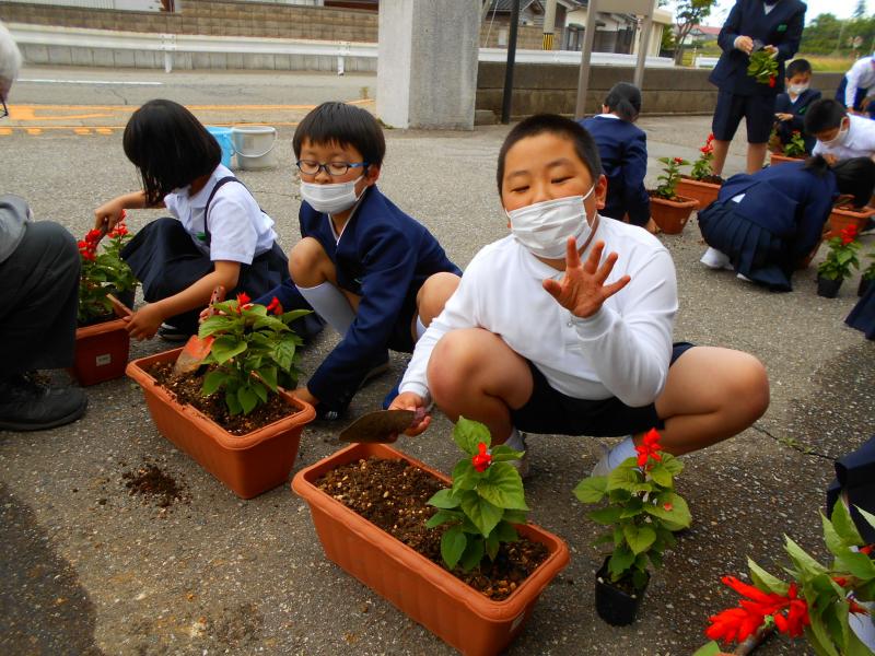 3・4年生が用務員さんに教えてもらいながら、サルビアの苗を植えました。児童玄関前に並べ、水やりなどの世話の当番を決め、毎朝続けています。 本校のこの時期の大切な仕事・活動です。赤いサルビアは、私達に元気を与えてくれますね。また、人と関わりながら本物に触れる体験活動を通して、心を豊かにできると思います。自然や環境にも目を向けることにもつながっていきます。今後も全学年において、積極的に体験活動を取り入れていきたいと思います。来週は、園芸委員会のみなさんがサルビアの苗を植え、職員玄関前に並べる予定になっています。楽しみです。